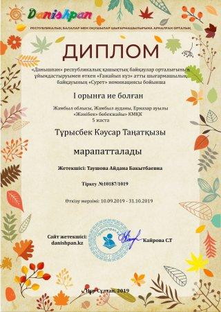 30 октябрь 2019 100 1 2 3 4 5 "Данышпан" республикалық қашықтық байқаулар орталығының ұйымдастыруымен өткен "Ғажайып күз" атты шығармашылық байқауының"Сурет"номинациясының марапаты
